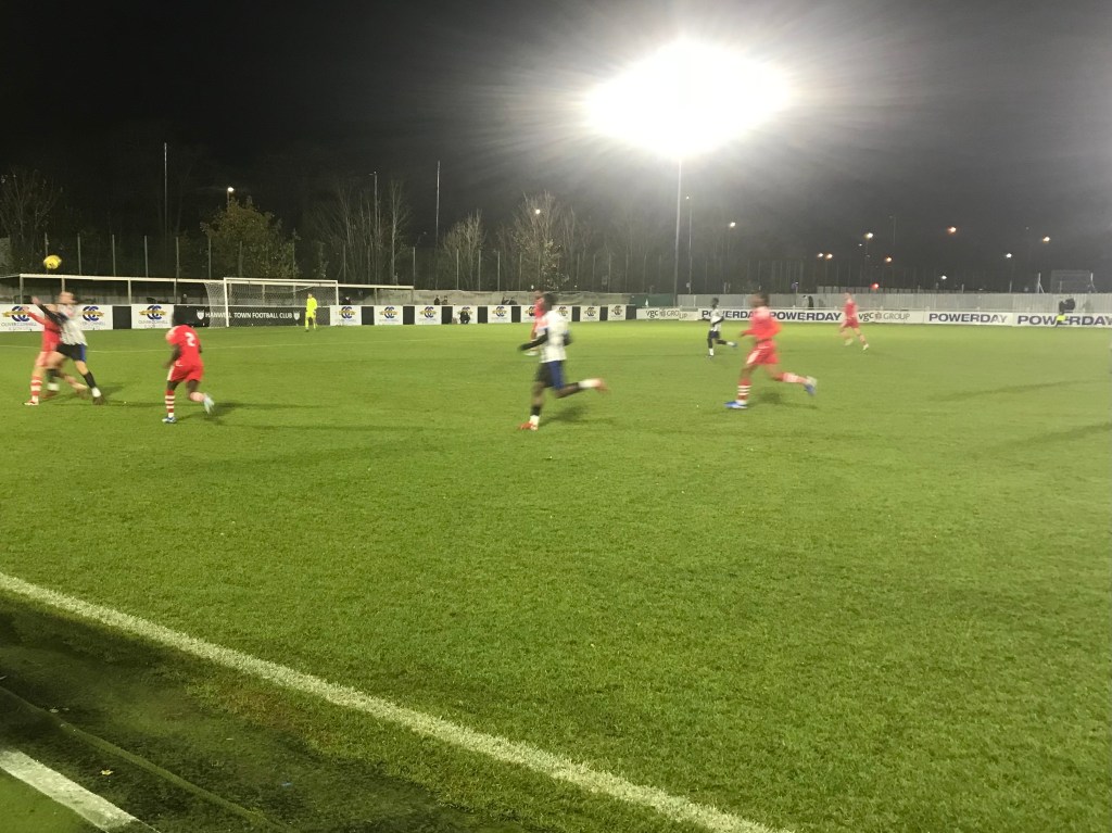 In this third round tie of the prestigious London Senior Cup, step 3 Southern League Premier Division South side Hanwell Town, faced step 5 Spartan South Midlands Football League Premier Division side Cockfosters, at The Powerday Stadium on Tuesday night. Hanwell Town are currently in 11th place in the Southern League Premier Division South, after 16 league matches played. Cockfosters FC are in second place in the Spartan South Midlands Football League Premier Division, after 16 league matches played. This promised to be a really good cup-tie in this famous old competition, and it was a very competitive game, which Hanwell Town won 2-0, thanks to two late goals. Started at a good pace, with Cockfosters competing really well during the opening stages of the game, it was the away side who created the first real chance of the match. As Antonio Michael got to the ball on the right flank, before taking it just inside of the Hanwell penalty area, before then passing it across to Ryan Hayes, on the edge of the box. Hayes’ low resulting effort on goal was however, well kept out by Trent Carter-Rogers, in the Hanwell goal.