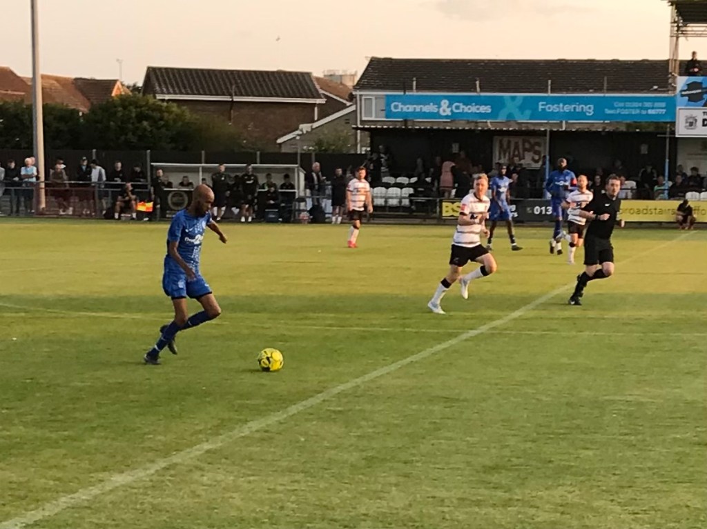 Deal Town would start this cup tie strongly. In the opening minute of the game, and following a Deal corner-kick the ball would fall to Rory Smith, inside the Hilltop box. Smith’s powerful effort would go over Hossam Hassan’s goal. Then, less than 30 seconds after Hilltop forward Drilon Krasniqi had appealed for a Hilltop penalty inside the Deal box, Deal would then counter forward with the ball at pace. Rory Smith would receive a short pass on the right-hand side of the Hilltop penalty area, but his powerful low effort would go across the face of the goal.
