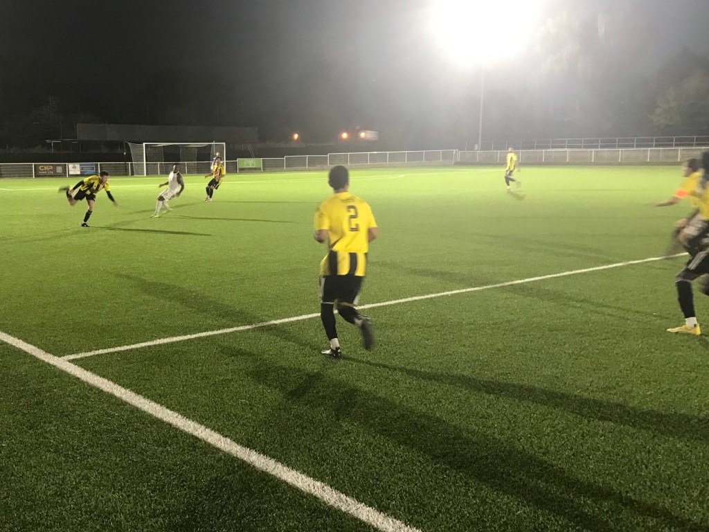 Following on from a lofted pass out to Munnir Saad on the right-hand side of the pitch, the Lymore forward would pass the ball across to Dylan Roberts, inside of the Frenford box. Roberts’ powerful low effort was parried by Razvan Marcu, before the ball was then cleared away. Soon after and late on in the tie, Lymore Gardens would regain their lead in this game. Dylan Roberts would pass the ball across to Lymore substitute Gravlyn Kitondo, who from the edge of the Frenford box would skilfully work the space with a nice step over, before then curling a sublime and deftly accurate effort in to the top right-hand corner of the Frenford goal, 2-1.