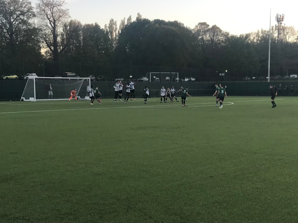 London Hibernian would react really well as a team, to going 1-0 down. And soon after a free-kick had been awarded to them, around 30 yards out from the AMG Ballerz goal, Ryan Varma would make it look as though he was going to take it. However, in the end and from a central position, Ryan Matthews powered a low effort into the bottom right-hand corner of the AMG Ballerz goal, 1-1. Towards the end of this very good first half of football, Jordan Grebe would receive a lofted pass to the left-hand side of the London Hibernian penalty area, before hitting a powerful effort off the outside of Conor Walsh’s near post.